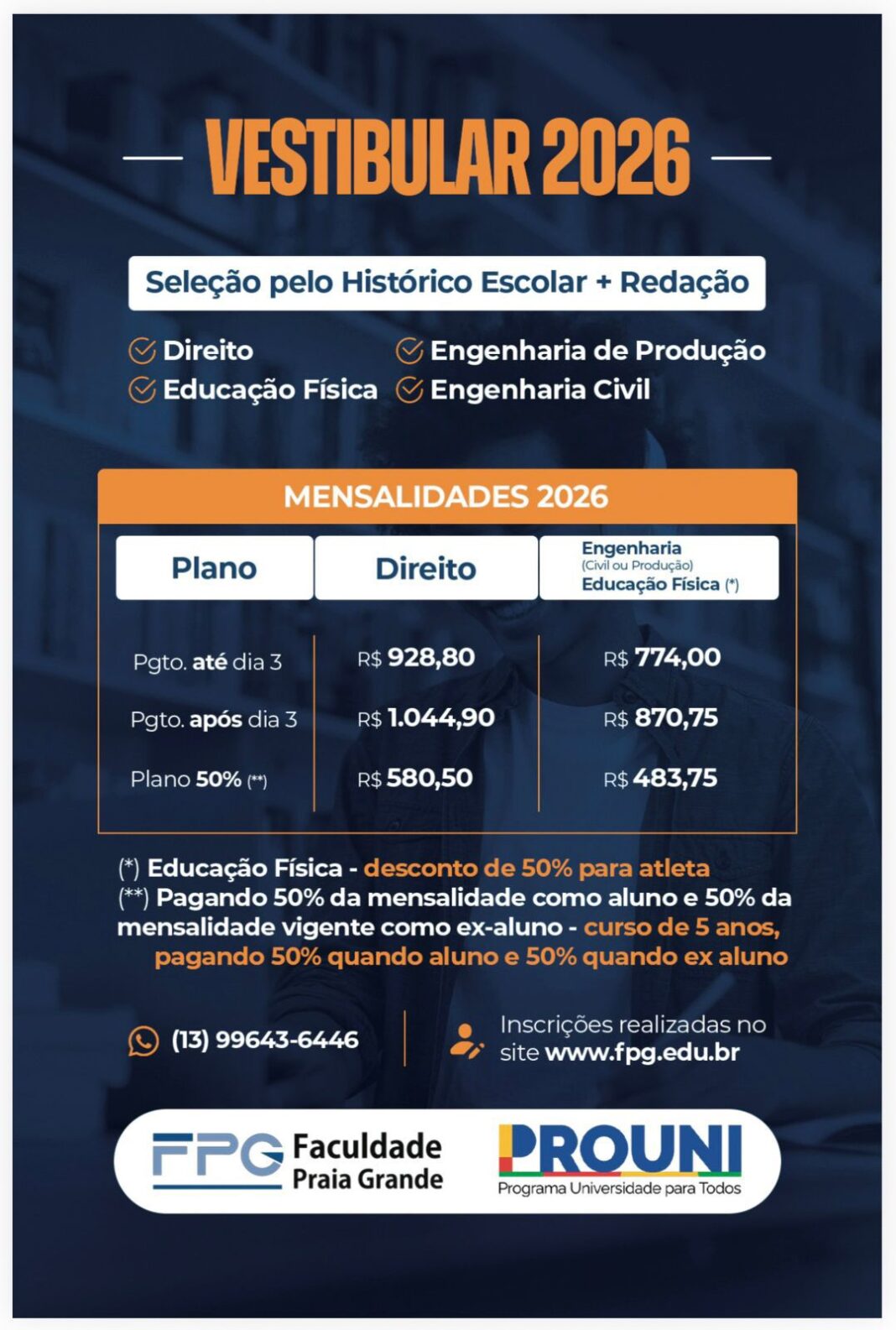 Entre em contato com a FPG e informe que viu esta publicação na AEAPG. O desconto será aplicado diretamente na mensalidade.