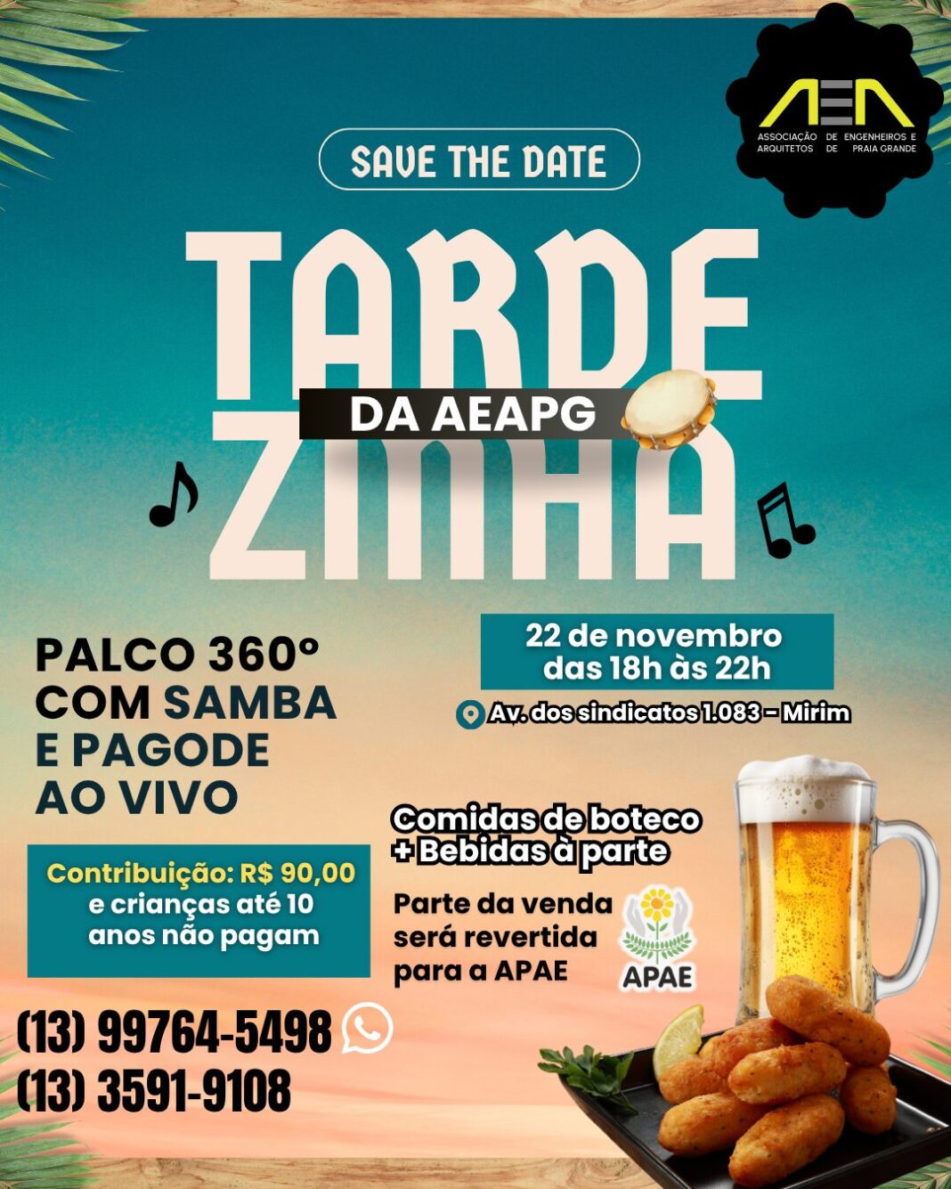 A Associação de Engenheiros e Arquitetos de Praia Grande (AEAPG) está preparando um evento imperdível para seus associados, familiares e amigos: a Tardezinha da AEAPG, que acontece no dia 22 de novembro, das 18h às 22h, na Av. dos Sindicatos, 1.083 – Bairro Mirim.